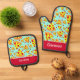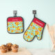 Elegante guante de horno con temática gastronómica y portamaletas, con un colorido patrón rojo y azul de rodajas de pizza de pepperoni. Ambos tienen texto personalizable para que añada su propio nombre o mensaje
