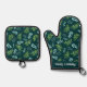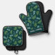 A pretty, blue and green dark watercolor floral design with your personalization on the top of the oven mitt.