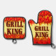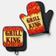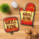 Un mitt de horno Grill King y un portamaletas en un tipo de letra occidental para cocineros y cocineros cocineros con arte gráfico de llamas rojas y naranjas en la parte superior e inferior del diseño.