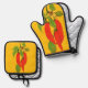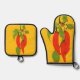 Red peppers art on oven mit. Bright and bold peppers with orange background.