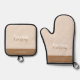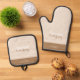 El Gourmet Catering Oven Mitt & Pot Holder Set tiene una tipografía y colores neutros que están en armonía, perfectos para un negocio de restauración de productos de cocina promocional.