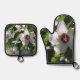 Un juego de portamaletas de horno con mantas de mitt-pot con una foto de un Rosa de Sharon.