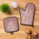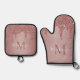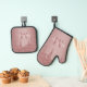 El Rosa Girly Gold Sparkle Purpurina Drips Monogram Oven Mitts and Pot Holders con modas tonificantes color rosa/rosa purpurina de oro gotea sobre un fondo de moda con su monograma y nombre personalizado.