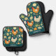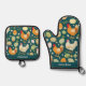 Bring a touch of rustic farmhouse charm to your kitchen with this chickens oven glove and pot holder set. This delightful set features a whimsical pattern of brown and white hens, roosters, and colorful Easter-style eggs on a rich, dark teal background. Personalize the name at the bottom for an individual touch.