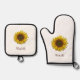 Rustic Sunflower boho botanical oven mitt and pot holder set, with elegant customizable script typography. Enjoy this personalized kitchen accessory for your cooking and baking needs.