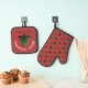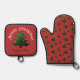 Personalice el conjunto de Navidades únicos y festivos Red y Green Oven Mitt & Pot Holder Set. Regalo de navidades con brillantes árboles de Navidad con brillantes chispas verdes. Foto de chispas, no purpurina real.