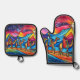 This potholder and oven mitt set features a stunning abstract Christmas design of the three wise men journeying on camels under the Star of Bethlehem. Reminiscent of stained glass, it showcases a vibrant blend of colors and bold lines that create a sense of movement and wonder. The radiant Star of Bethlehem draws the eye, symbolizing guidance and hope. These kitchen essentials are ideal for those who appreciate unique, artistic holiday designs and are the perfect choice for those who enjoy colorful and modern interpretations of traditional Christmas themes. Available as a set or individually.