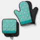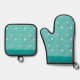 Un mitt de horno con un patrón de estrella retro en verde azulado y blanco sobre un fondo verde azulado claro y un borde verde azulado oscuro.