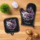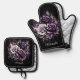 Este ilustracion cuenta con tres hermosos rosas, uno blanco y dos violetas, rodeados de elegantes decoraciones negras y violetas. Los tonos oscuros y los detalles complejos crean una atmósfera misteriosa y gótica, mientras que las partes más ligeras añaden contraste y profundidad extra. Para un toque de personalización, considere la posibilidad de añadir un nombre o monograma al Oven Mitt y al Pot Holder.