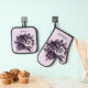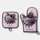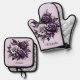 Este ilustracion cuenta con tres hermosos rosas, uno blanco y dos violetas, rodeados de elegantes decoraciones negras y violetas. Los tonos oscuros y los detalles complejos crean una atmósfera misteriosa y gótica, mientras que las partes más ligeras añaden contraste y profundidad extra. Para un toque de personalización, considere la posibilidad de añadir un nombre o monograma al Oven Mitt y al Pot Holder.
