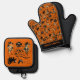 Dress up your kitchen for Halloween retro style with this pot holder and oven mitt set. Both feature vintage style Halloween graphics with witches, cats, bats, owls, jack-o-lantern pumpkins and stars in a black, orange and cream color scheme. The square pot holder has a spot to add your own custom message or leave the HAPPY HALLOWEEN message as is. The oven mitt has a spot for you to add your own custom text in orange lettering along the black border.