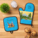 Vista de montaña con criaturas del bosque, familia de venados y pájaros. Texto para personalización.
