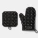 Destei's white polka dots pattern on a black background color. There is also a personalizable text area for a name or other custom text on the oven mitt.