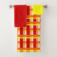El conjunto de toallas incluye un lavabo amarillo, una toalla de mano roja y una toalla de baño con un diseño Art Decó de una manta con líneas gruesas y delgadas en rojo, naranja y amarillo.