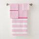 El cuarto de baño está decorado con toallas de baño de rayas blancas y rosas modernas. Este conjunto de toallas está diseñado para un chica moderno. Coordina este juego de toallas con el mismo color rosa en una toalla de motivos florales y eso le dará un toque de atención a la decoración. Comprar como toalla básica o regalar como regalo en una casa o en otra ocasión.