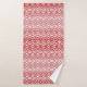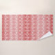 Este conjunto de toallas incluye un paño de lavabo rojo, una toalla de mano rosa y una toalla de baño con un diseño Art Déco de diamantes superpuestos en efecto sombrío de rojo en un campo blanco.