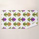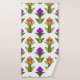 Este juego de toallas incluye un lavabo naranja, una toalla de mano morada y una toalla de baño con un diseño Art Déco hecho de diamantes, triángulos y polígonos haciendo tulipanes en naranja y morado con tallos y hojas verdes.