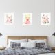Añada los toques finales a la guardería de su bebé o a la habitación de su hijo con estas hermosas impresiones de arte. El diseño presenta princesa con pelo rubio y flores color de agua rosada.