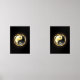 Joyería, oro y símbolo yin yang negro sobre fondo negro. Oro yin yang.