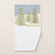 Se muestra un familiar saludo de Navidad con árboles dorados dorados, agrupados en un lugar nevado, con una estrella sagrada brillante y simbólica, contra un cielo de pizarra azul.