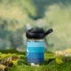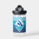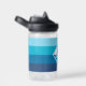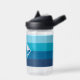 Una ilustracion de tiburon con un fondo de lineas horizontales de diferentes tonos de azul que cubre al rededor de la botella, en la parte trasera se puede personalizar