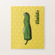 Un shishito verde pimienta chile, también conocido como kkwari-gochu en coreano, está decorado con patrones inspirados en diseños coreanos y se sienta en un fondo amarillo con una versión más pequeña del mismo patrón y una etiqueta de escritura en la esquina. Esta pimienta suave se come en todo Corea y Japón tanto cruda como cocida.
