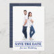 Aquí tienes un divertido diseño para la pareja que disfruta navegando o en barca. Debajo de la foto, en la parte delantera, está "GUARDAR LA FECHA" "para nuestra boda". En la parte trasera, hay un borde azul con olas de color dorado. En la parte superior del diseño hay un ancla azul que puedes quitar o reemplazar. Este diseño se muestra con un código QR (que puedes crear) que se puede enlazar y escanear a un sitio web para obtener información sobre la boda.