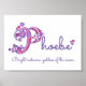 Arte de letra mayúscula P monograma nombre cartel perfecto para el dormitorio o sala de juegos de una niña en tonos de rosa y púrpura. Personalice con su propio nombre que comience con P, y el significado del nombre para un toque verdaderamente personalizado para el dormitorio o guardería de su niña. Este cartel dice nombre Phoebe Brillo radiante, diosa de la luna. Impresión de cartel lindo ideal para un regalo de bebé nuevo, bautizo o baby shower. © Único monograma de letra P dibujo de corazones y flores y diseño gráfico por Sarah Trett. www.sarahtrett.com para www.mylittleeden.com