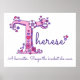 Hermoso cartel con monograma de la letra T perfecto para el dormitorio o sala de juegos de una niña en tonos de gris, blanco, amarillo, rosa y morado. Personalízalo con el nombre corto de tu hijo que comience con T, y el significado del nombre para un toque verdaderamente personalizado en el dormitorio o nursery de tu hijo, este ejemplo es para el nombre T Therese Una cosechadora. Cosecha la bondad que siembra. Lindo cartel ideal como regalo para un bebé recién nacido, bautizo o baby shower. © Diseño único de monograma de la letra T con corazones y flores y diseño gráfico por Sarah Trett. www.sarahtrett.com para www.mylittleeden.com