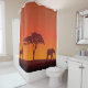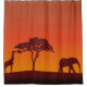 Fondo africano del paisaje del safari que ofrece siluetas de una jirafa, de un árbol y de un elefante contra la puesta del sol en sombras del color anaranjado y rojo.