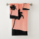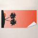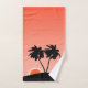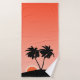 Toalla colocada en una silueta negra de palmeras en una isla tropical, sobre un fondo de degradado naranja al atardecer