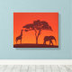 Un paisaje de safari africano con siluetas de una jirafa, un árbol y un elefante en tonos naranjas y rojos frente a la puesta de sol.
