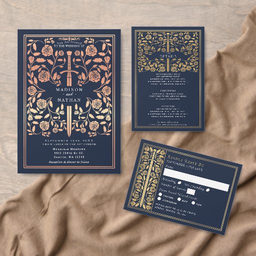 Celebrate your special day with these Royal Medieval Sword Wedding RSVP Cards against a blue background. You can customize this further by clicking on the "PERSONALIZE" button. PLEASE NOTE: The silver on this item is NOT real foil and is printed in flat colors