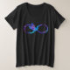 Símbolo de infinito violeta y brillante con colibrí azul sobre fondo negro. Neón.