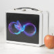 Símbolo de infinito violeta y brillante con colibrí azul sobre fondo negro. Neón.