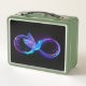 Símbolo de infinito violeta y brillante con colibrí azul sobre fondo negro. Neón.
