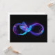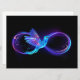 Símbolo de infinito violeta y brillante con colibrí azul sobre fondo negro. Neón.