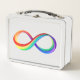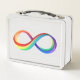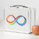 Símbolo claro de infinito de capas plásticas de colores saturados rojo, amarillo, verde, turquesa, azul y violeta sobre fondo blanco.