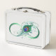 El símbolo del infinito con una pluma de pavo real brillante, verde y artística sobre un fondo blanco. Estilo tatuaje.