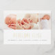 Un simple anuncio del nacimiento de una foto bebé con el nombre del Relieve metalizado de oro y 3 fotos en la parte delantera. La parte de atrás tiene una foto horizontal y un mensaje personal de los nuevos padres. Esta moda, de diseño moderno, no interfiere con las fotos, sino que la complementa. Una moderna tarjeta de invitación para bebés con detalles minuciosos y un diseño limpio. Haga clic en el botón de edición para personalizar los colores de fondo y las fuentes.