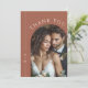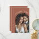 Sus invitados a la boda estarán felices de recibir esta hermosa y elegante tarjeta de agradecimiento de boda en terracota terrosa con una foto especial de su día de bodas. Simple, elegante y de buen gusto, este diseño clásico presenta un borde de línea delgada a lo largo del borde izquierdo con la inicial del monograma de la novia y el novio. La hermosa letra serif deletrea Gracias en texto curvo sobre la plantilla de la foto del arco. Reemplace la foto de muestra con su foto seleccionada. La parte posterior de la tarjeta tiene una plantilla de texto con un mensaje de agradecimiento de muestra que puede usar tal como está, o personalizar con sus propias palabras, junto con los nombres de la novia y el novio.