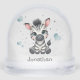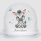 Cute baby shower or birthday snow globe gift or favor, featuring adorable little male zebra sitting on clouds with some blue love hearts