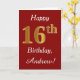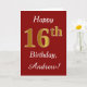Este sencillo diseño de tarjeta de cumpleaños incluye el mensaje "Feliz 16º cumpleaños", con el "16º" con un falso aspecto dorado. También cuenta con un nombre personalizado y un fondo rojo oscuro. Se podría dar a alguien que esté celebrando su decimosexto cumpleaños.
