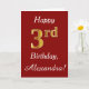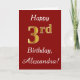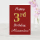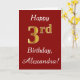 Este sencillo diseño de tarjetas de cumpleaños incluye el mensaje "Feliz tercer cumpleaños", con el "tercero" en apariencia de oro falso. También incluye un nombre personalizado y un fondo rojo oscuro. Podría ser dado a alguien que está celebrando su tercer cumpleaños.
