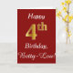 Este sencillo diseño de tarjetas de cumpleaños incluye el mensaje "Feliz cuarto cumpleaños", con el "cuarto" en apariencia de oro falso. También tiene un nombre personalizado y un fondo rojo oscuro. Podría ser dado a alguien que está celebrando su cuarto cumpleaños.