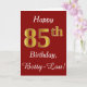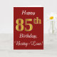 Este sencillo diseño de tarjeta de cumpleaños incluye el mensaje "Feliz cumpleaños 85", con el "85" en apariencia de oro falso. También incluye un nombre personalizado y un fondo rojo oscuro. Se podría dar a alguien que esté celebrando su cumpleaños número ochenta y cinco.