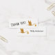 Esta es una idea divertida y simple para expresar tu gratitud. Práctico para fiestas de cumpleaños y duchas para bebés y ofreciendo gracias todos los días; ¡úsalo para lo que quieras! En un moderno tipo de letra serif, todo en mayúsculas, la declaración de un lado dice "¡Gracias!" Al lado, un gráfico que representa una cigüeña voladora que lleva a un bebé -adornado con un falso Relieve metalizado de oro- decora la carta, por lo demás simple y llana. La cigüeña aparece a cada lado de la tarjeta. Al revés, en una fuente sans-serif de bonito, es el titular de un lugar para su nombre o nombres. Todas las capas se han desbloqueado para que pueda ajustar y personalizar según lo desee. Por favor, no dudes en contactarte si necesitas ayuda. // Diseñado por Melody Watson para la Muserie de Papel.