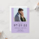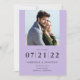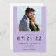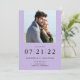 Esta simple tarjeta de fecha de guardado ofrece una foto en la parte delantera y otra en la parte trasera. El fondo es morado claro con la fecha boda que aparece grande en negro.