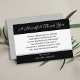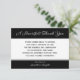 Cuando les damos las gracias, su simpatía viene del corazón. Este diseño presenta las palabras "Un sincero agradecimiento" en plata sobre fondo negro. El saludo de agradecimiento por su simpatía aparece justo debajo sobre un fondo blanco. En la parte inferior de un fondo negro y plateado está el nombre de tu ser querido. Esta es una manera encantadora de agradecerte por tu simpatía.