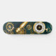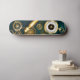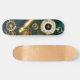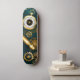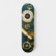 Una lupa antigua con mango dorado y lente convexa sobre el fondo verde con los engranajes dorados y un reloj antiguo. Estilo Steampunk.